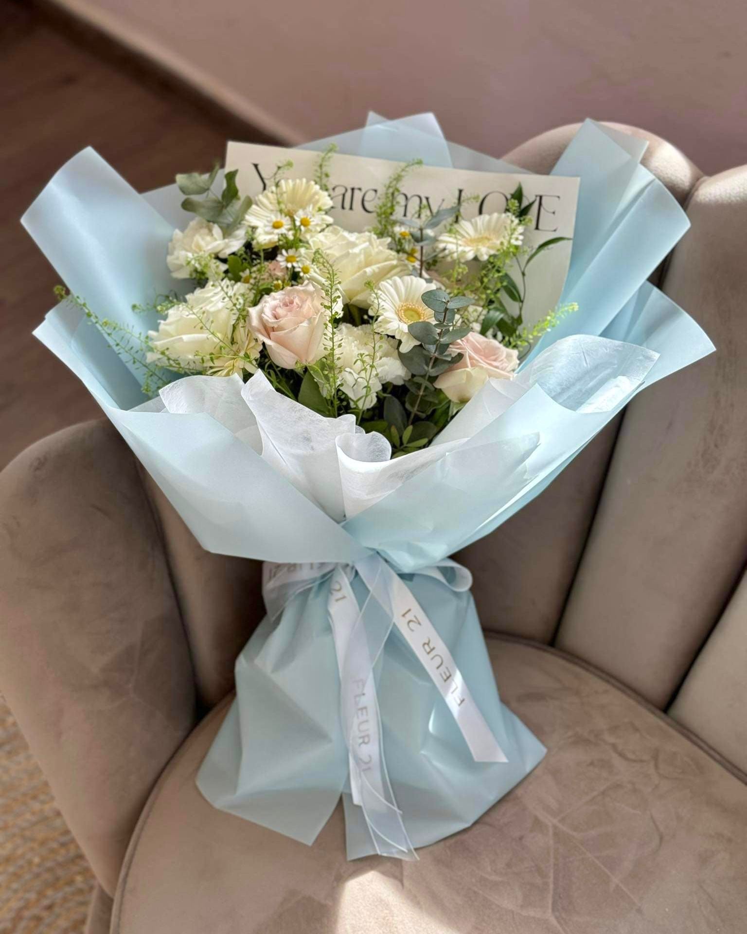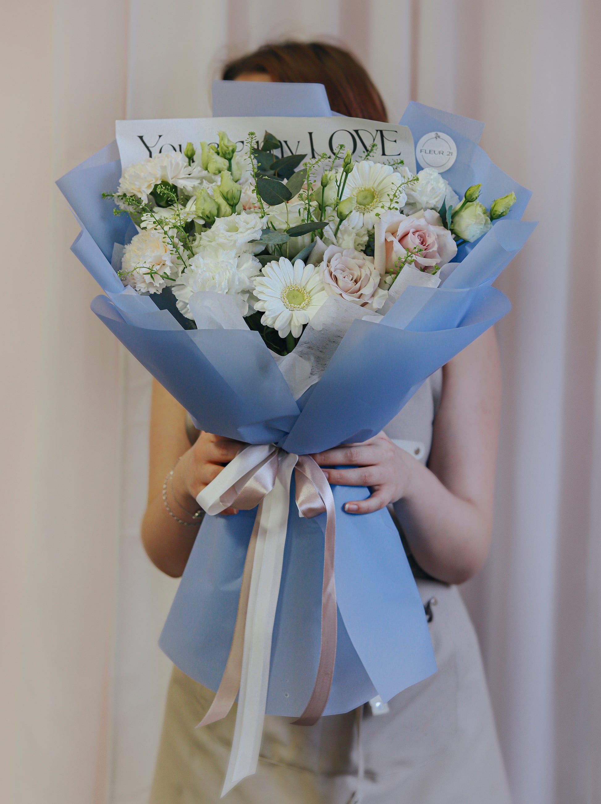 Bouquet of fresh flowers inspired by the summer sky. Each of our bouquets is unique, and we arrange them according to our current offer, which may slightly differ from the photo.