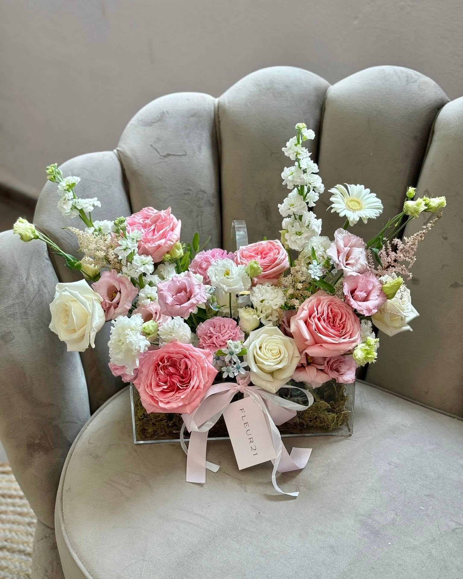 Originální květinový košík z čerstvých květin. Květiny jsou vypíchané v průhledném košíku. Každá naše kytice je originální a vážeme je dle naší aktuální nabídky.