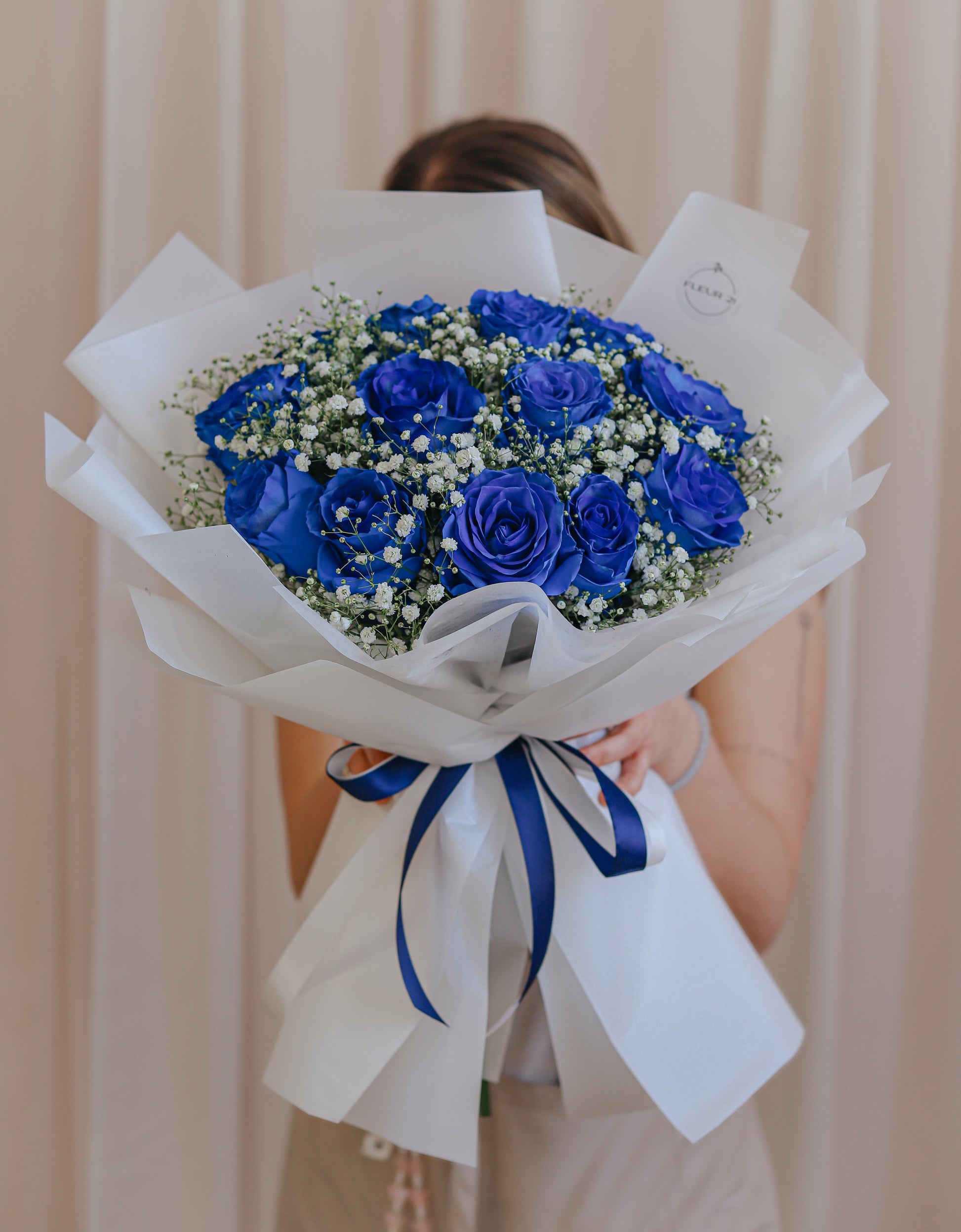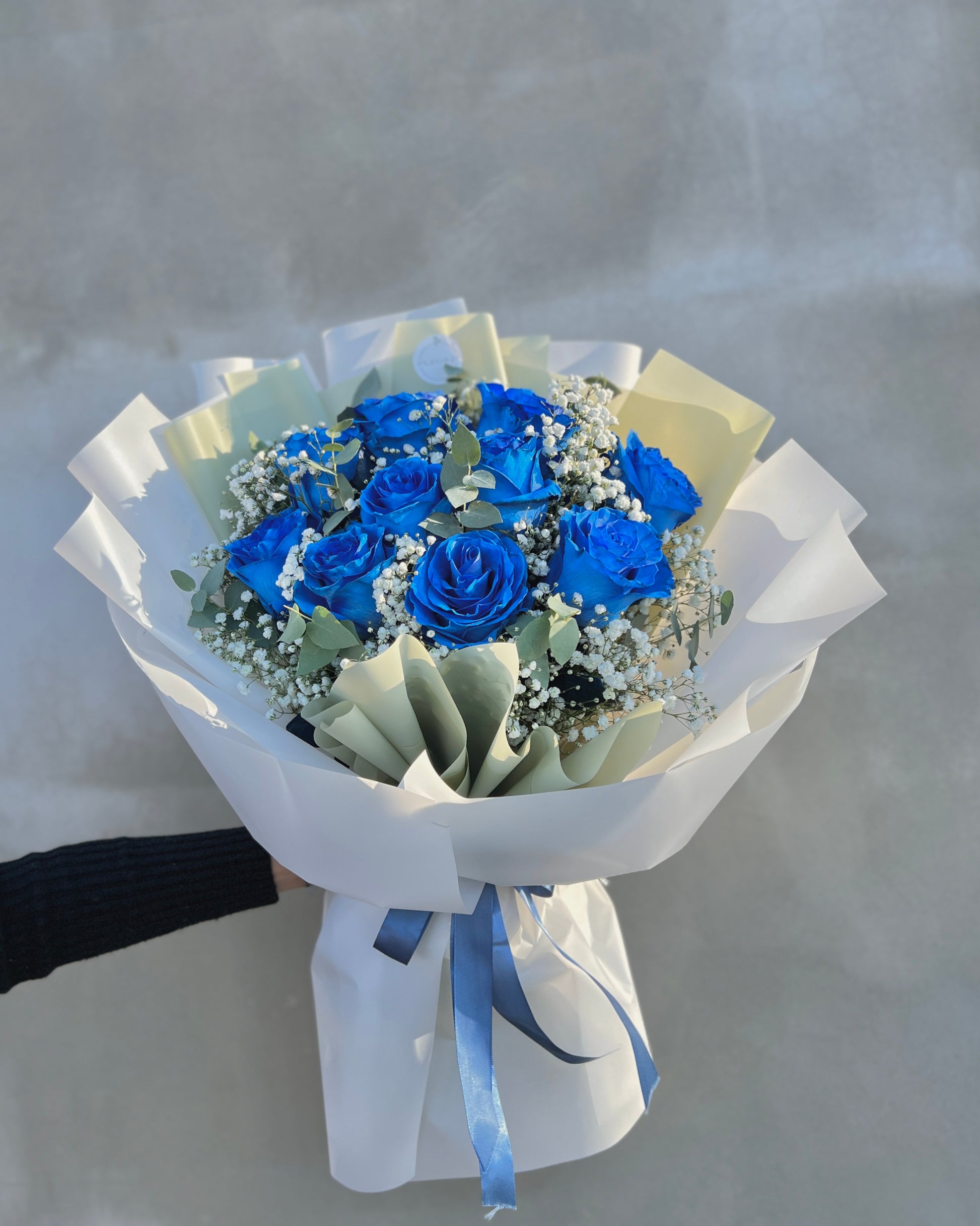 Modré ekvádorské růže s eucalyptem a gypsophilou.