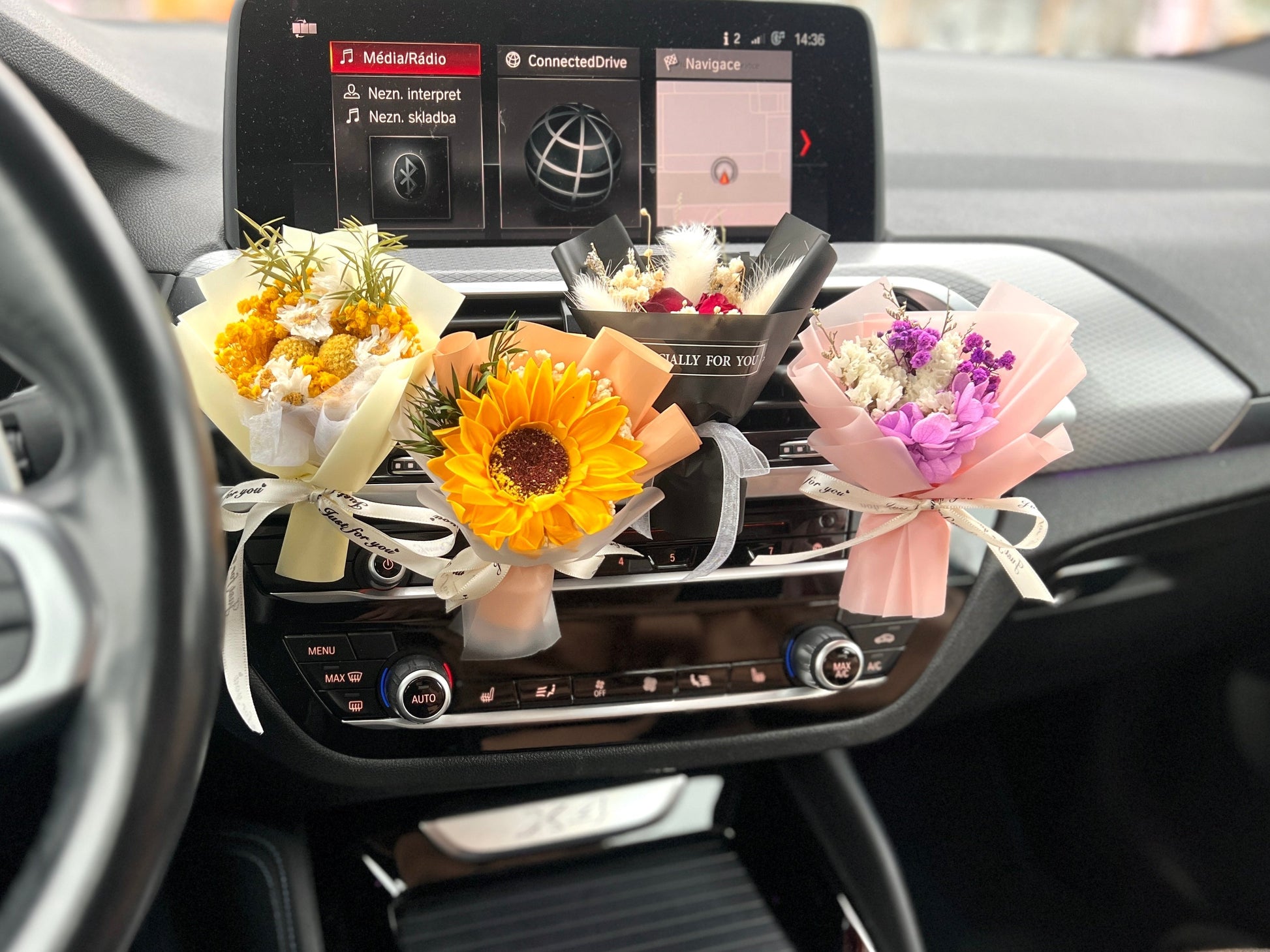 Комплектація:букет (прибл. 15 см), автомобільний тримач, автомобільний ароматизатор.